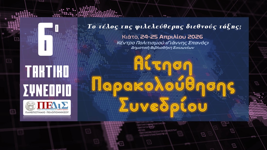 Η Οργανωτική Επιτροπή του 6ου Τακτικού Συνεδρίου – «Το τέλος της φιλελεύθερης διεθνούς τάξης;» του Τμήματος Πολιτικής Επιστήμης και Διεθνών Σχέσεων του Πανεπιστημίου Πελοποννήσου, σας καλεί να υποβάλετε στην ακόλουθη φόρμα αίτηση παρακολούθησης των εργασιών του Συνεδρίου που θα διεξαχθεί στο Κιάτο, 24 και 25 Απριλίου 2026.